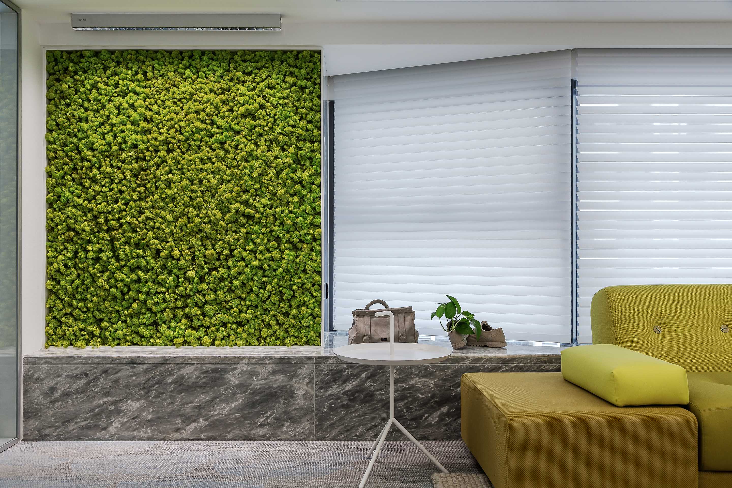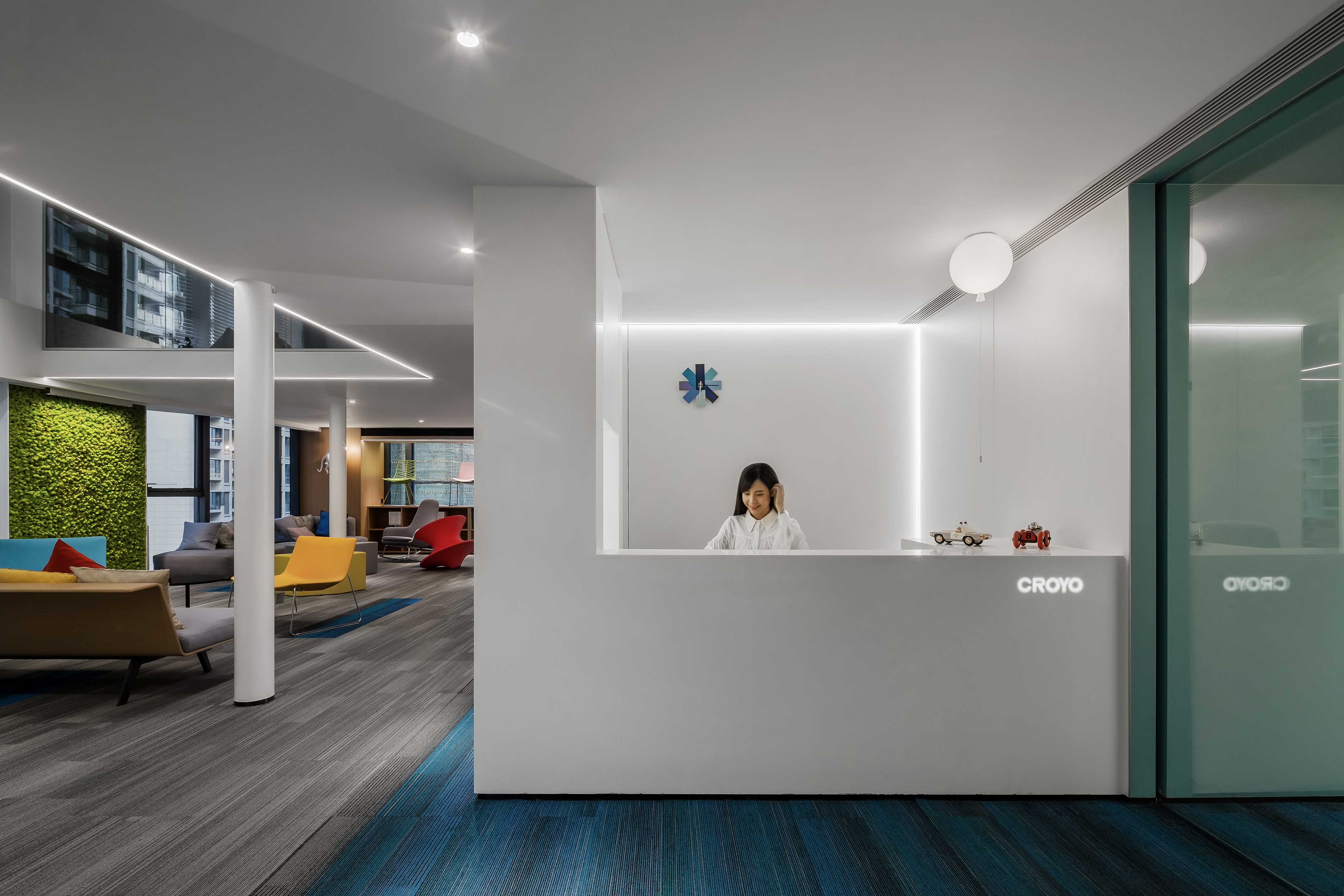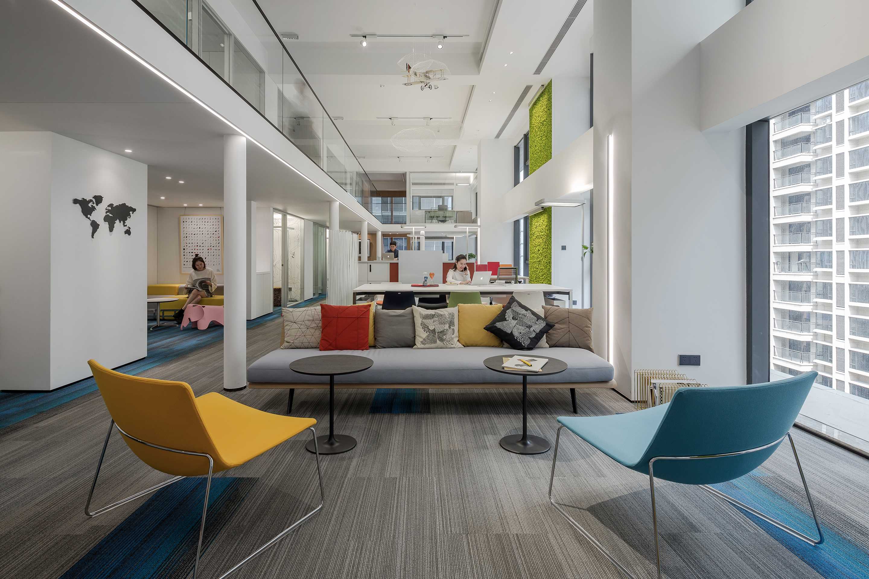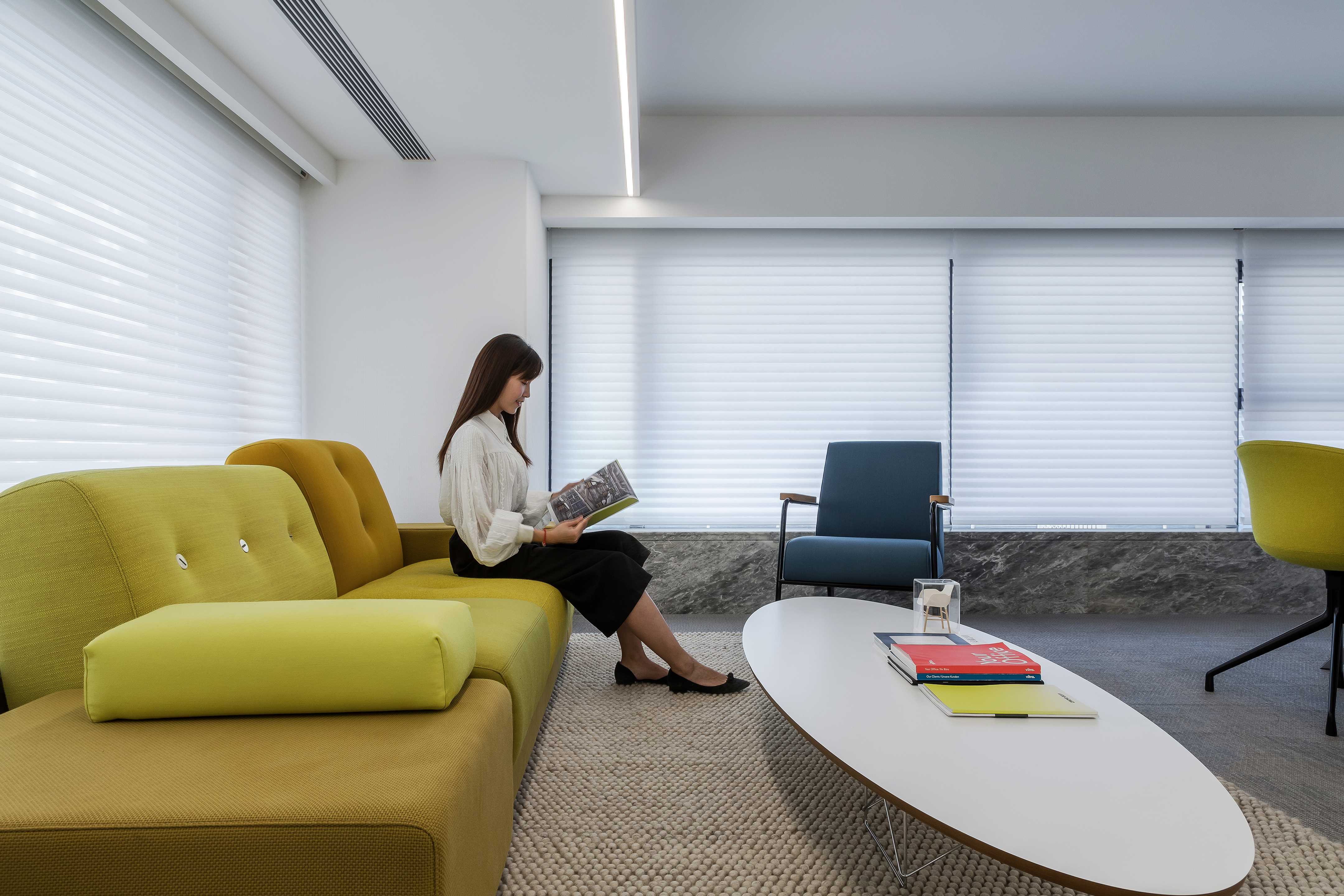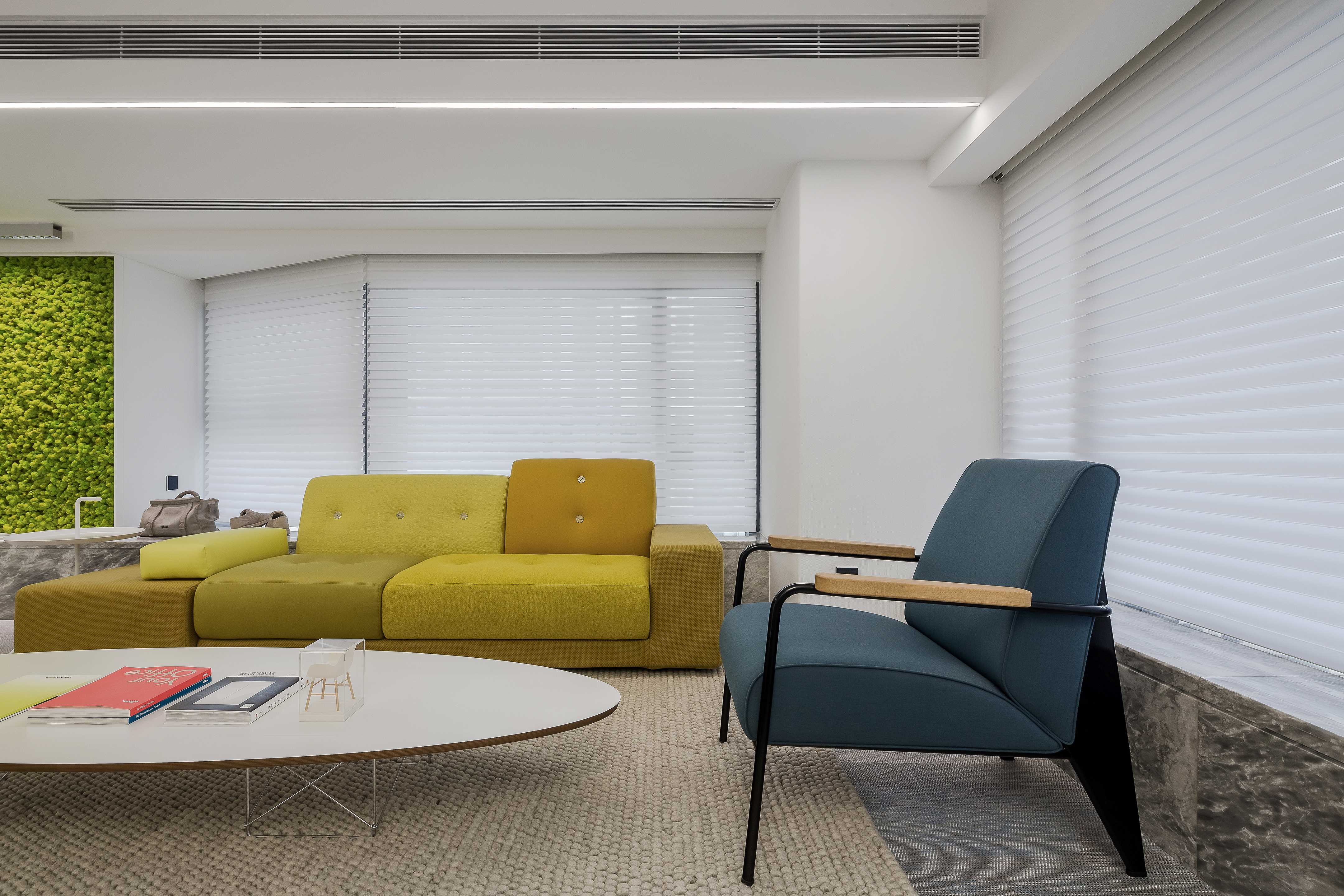 Do not add the white clean metope that decorate and be born door window of large area to lay concise fundamental key for the public space of all height, red yellow blue piece intersperse jumps at carpet, furniture and deserve to act the role of, the delicate transformation between color department is just right, gift pure white space rich expression is imsensible however messy. The immortal moss green wall acts as a giant hanging painting, injecting the fresh vitality of nature into the space.