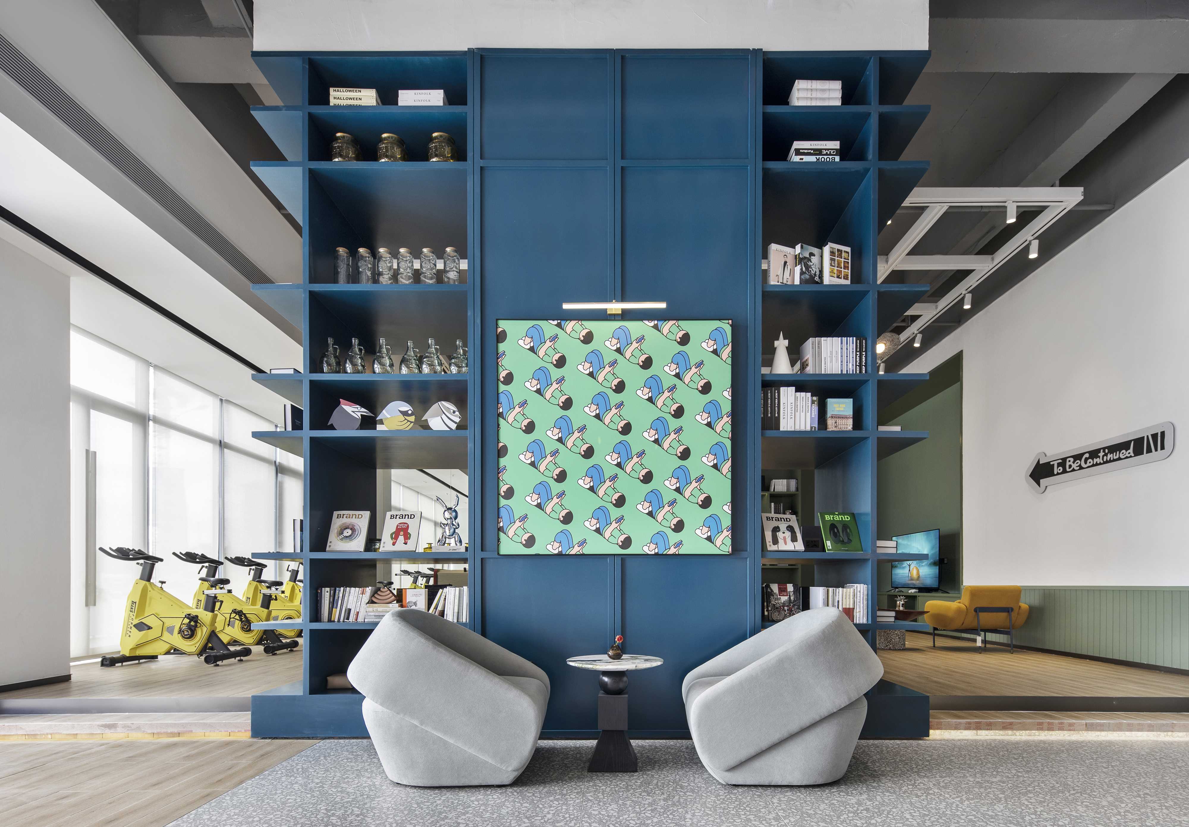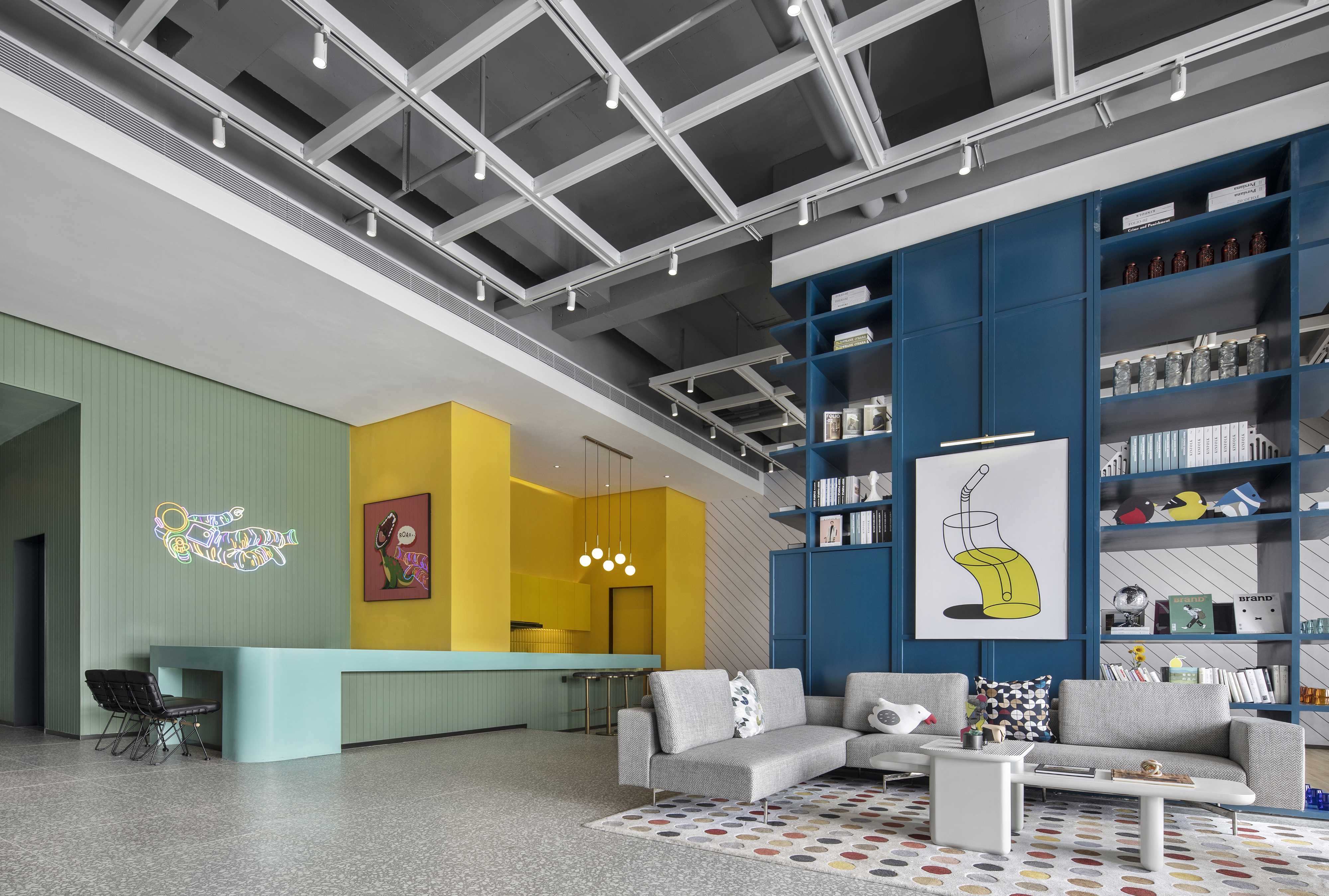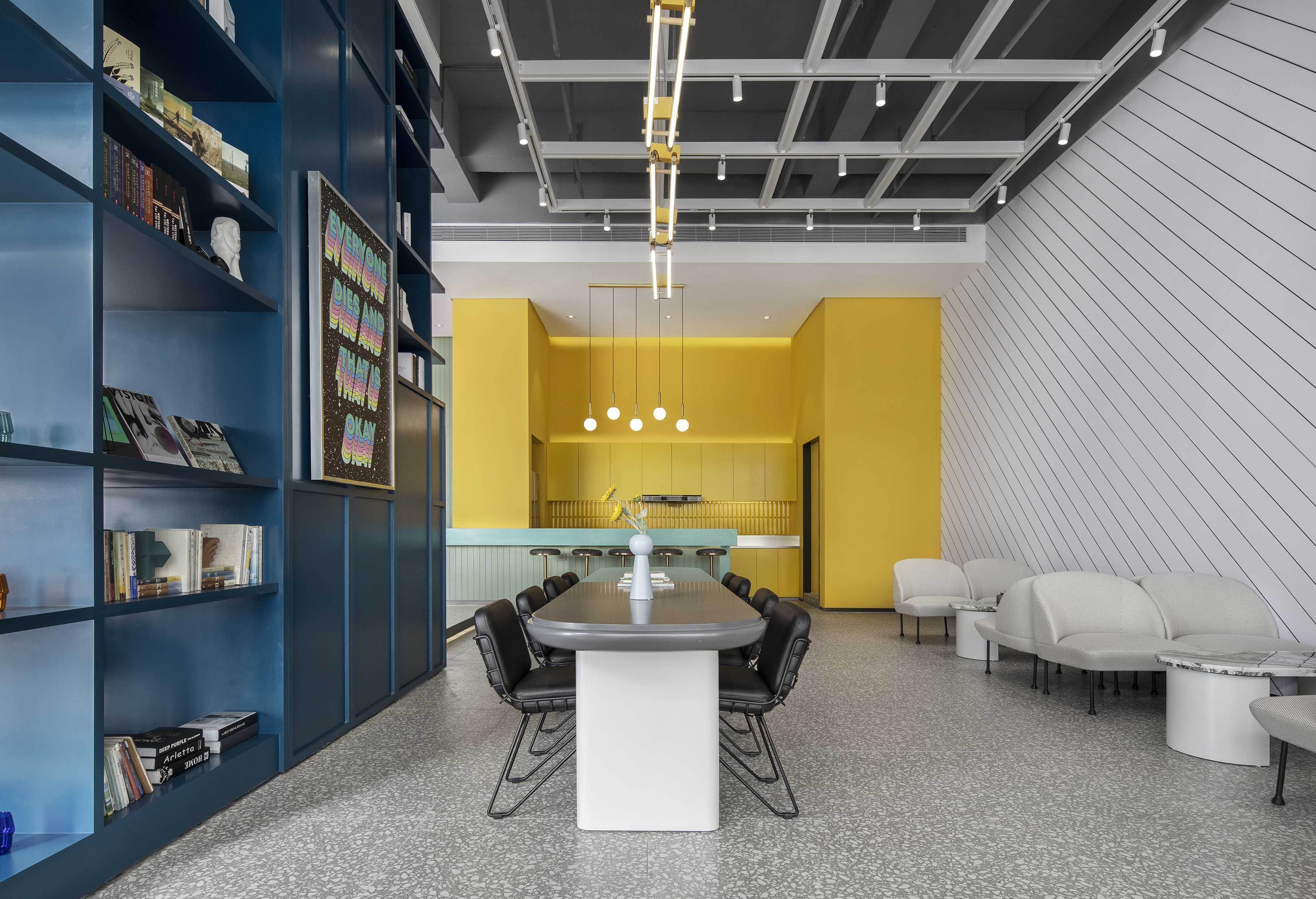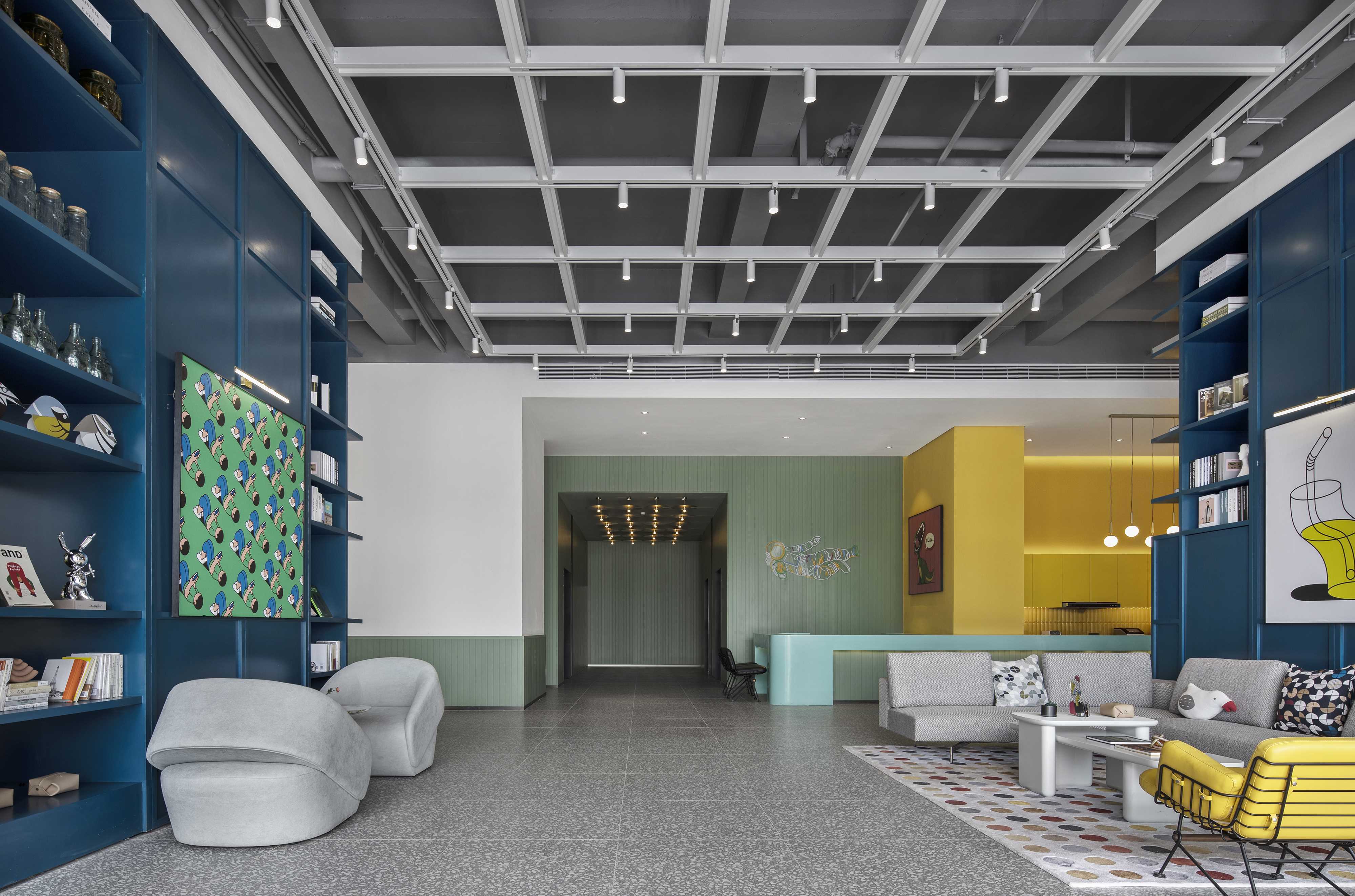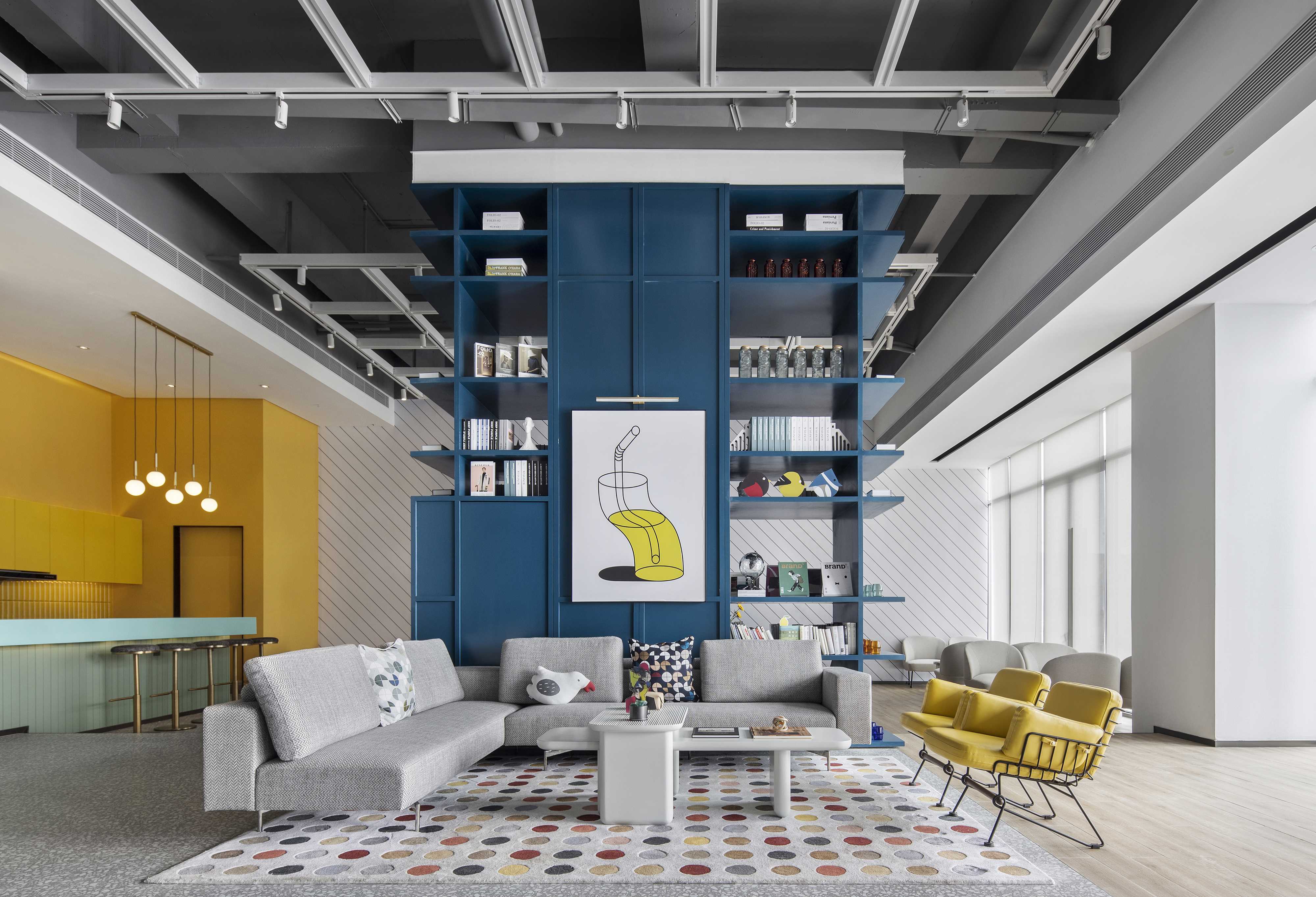 Space connects people, and people socialize in space. The lobby is no longer just a place for your daily visits and short stays. Its functions are diversified and refined. It is the third space opened up between home and company. With multiple formats, multiple functions, and multiple gameplays, people stay here to experience, talk, and socialize. In this space, we hope to establish a sense of belonging for the residents and realize multiple life scenarios.The shared lobby is like a community living room in the city, which can provide humanized functional settings, and is a complex space without boundaries, freedom and enjoyment. Use bright colors to create a young, vibrant, stylish and bold space atmosphere. Let those who come here can enjoy the fun of "shared" life. The blue high bookcase divides the space, and the partition of the shelves maximizes the relationship between the spaces.In the era of big data interaction, it seems that in addition to passive social scenes, it seems that young people can hardly find the fun of face-to-face social entertainment, and they are more likely to gather together based on passive relationships. At this moment, we need to rescue people from self-entertainment, participate more in groups, and integrate into conversation and entertainment. Put down your phone and go out to meet more friends. In leisure time, you can also invite three or five friends to watch a favorite movie and play a cheerful game. Here, different functions deduce different scenarios.