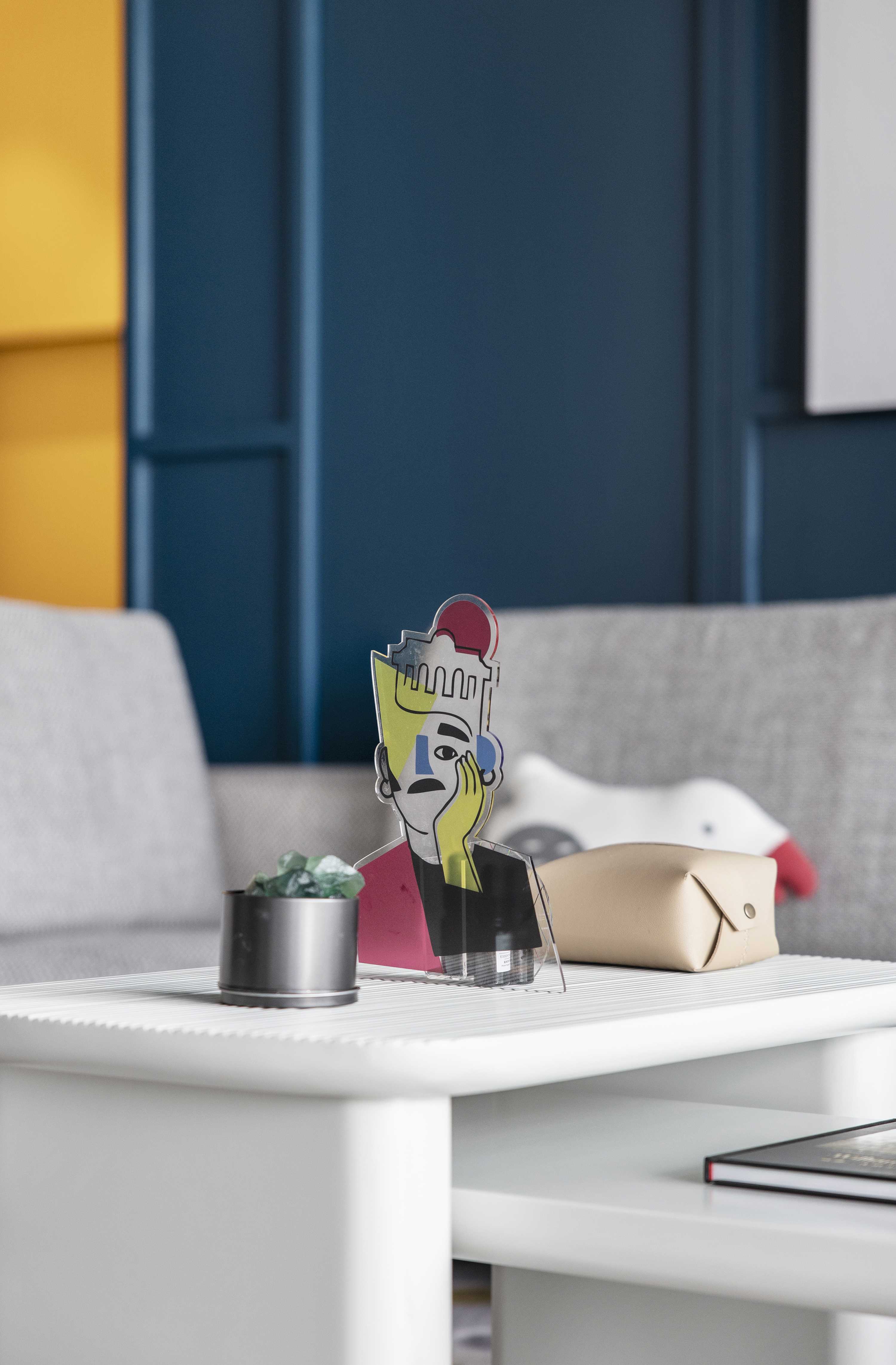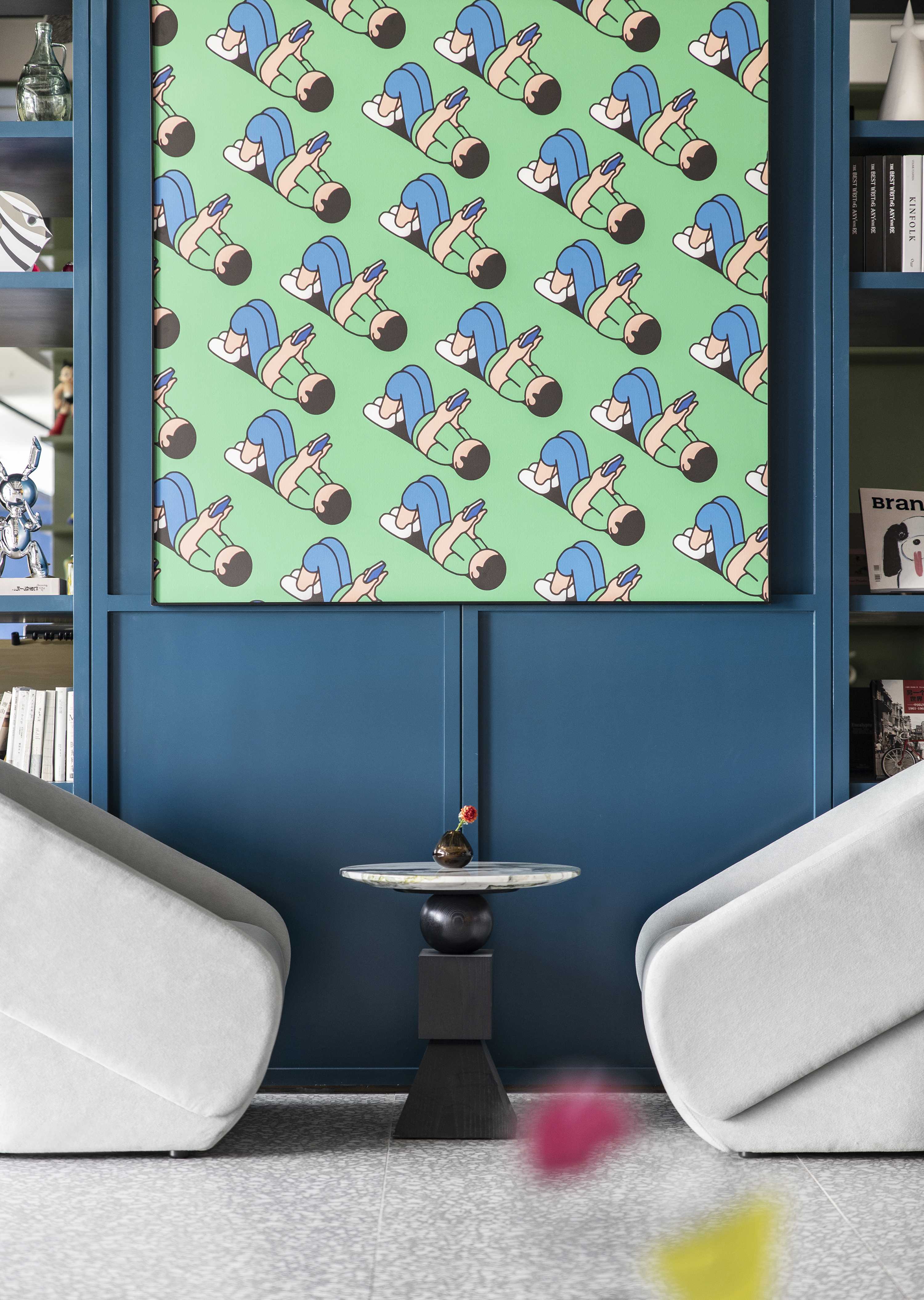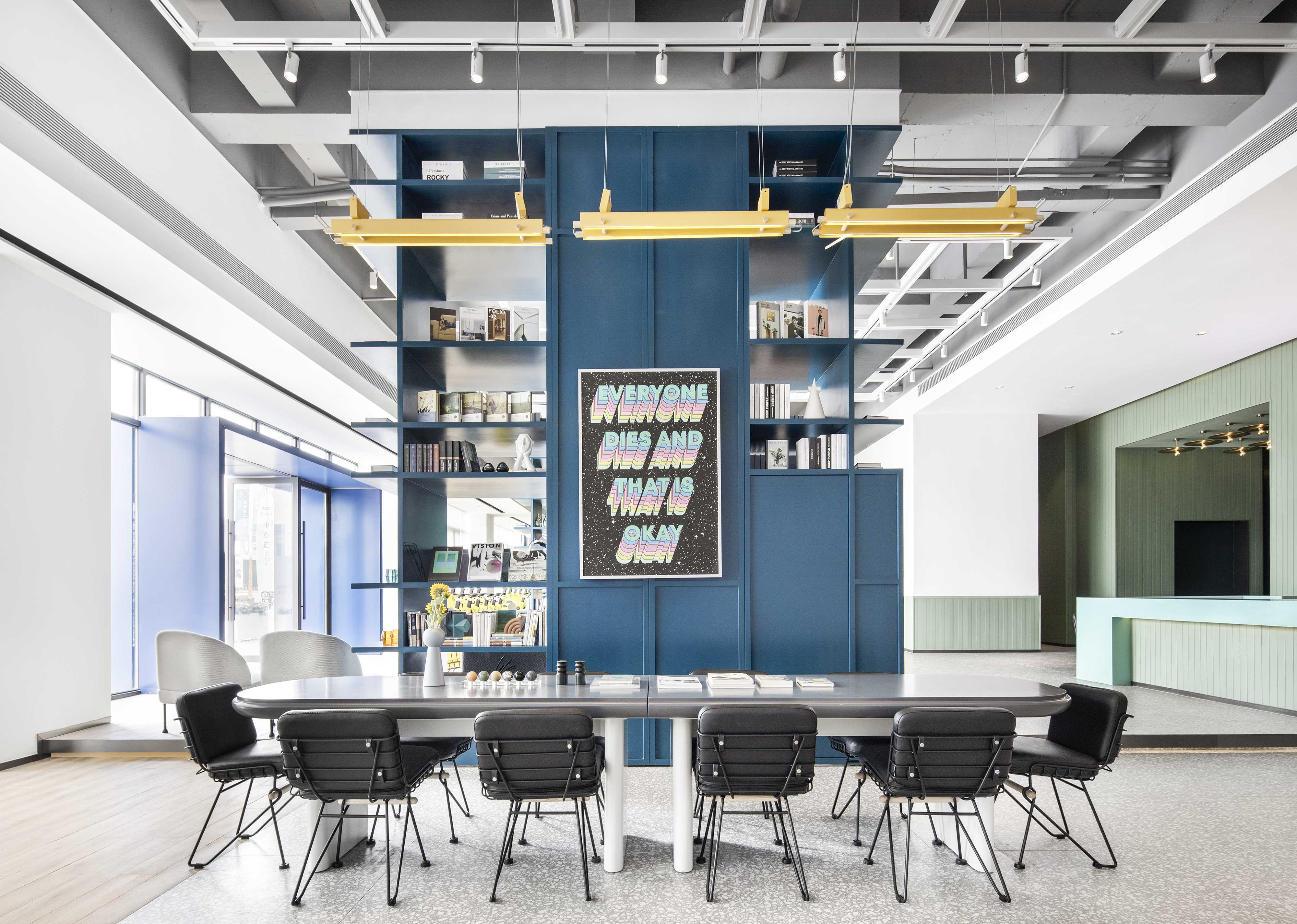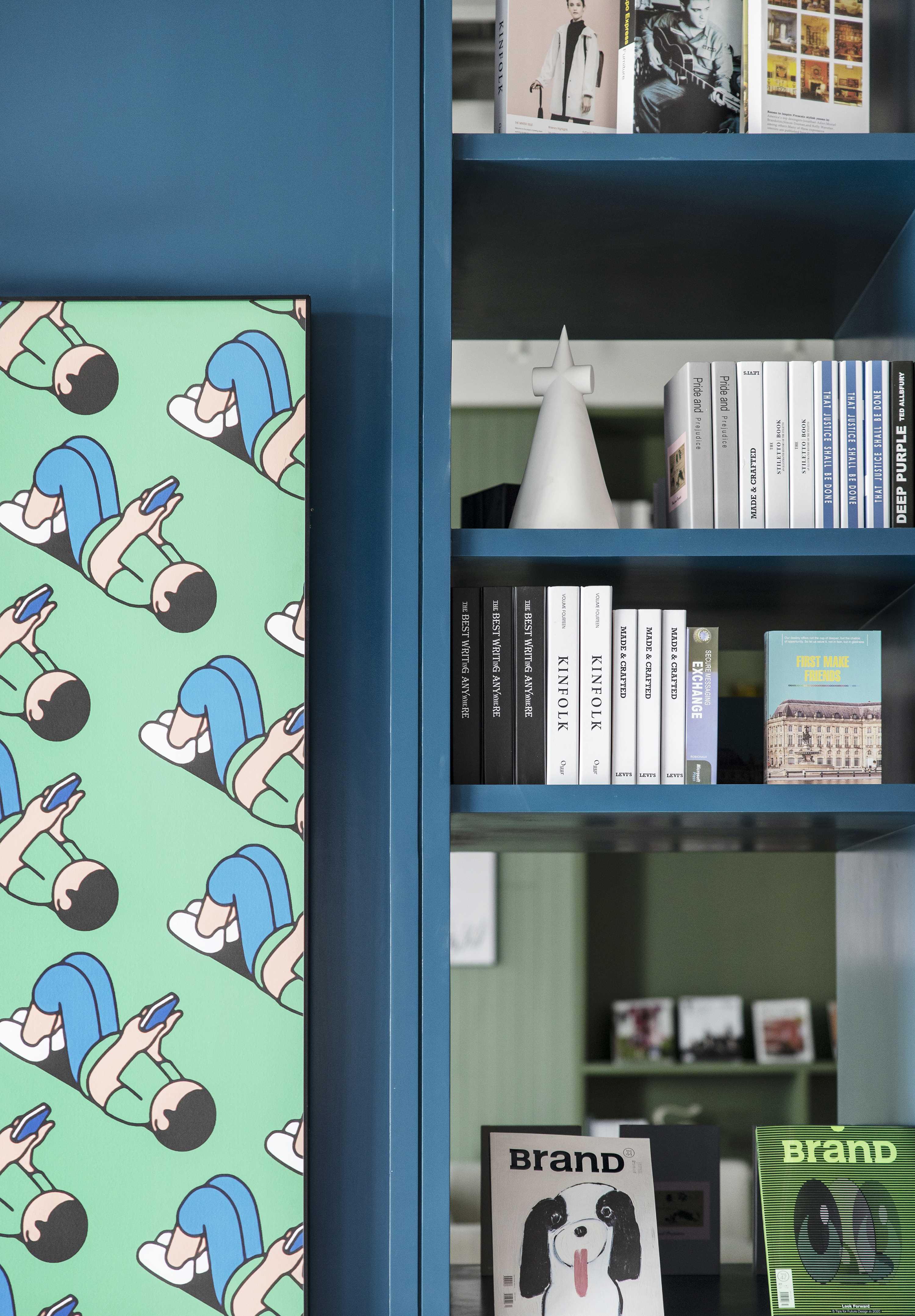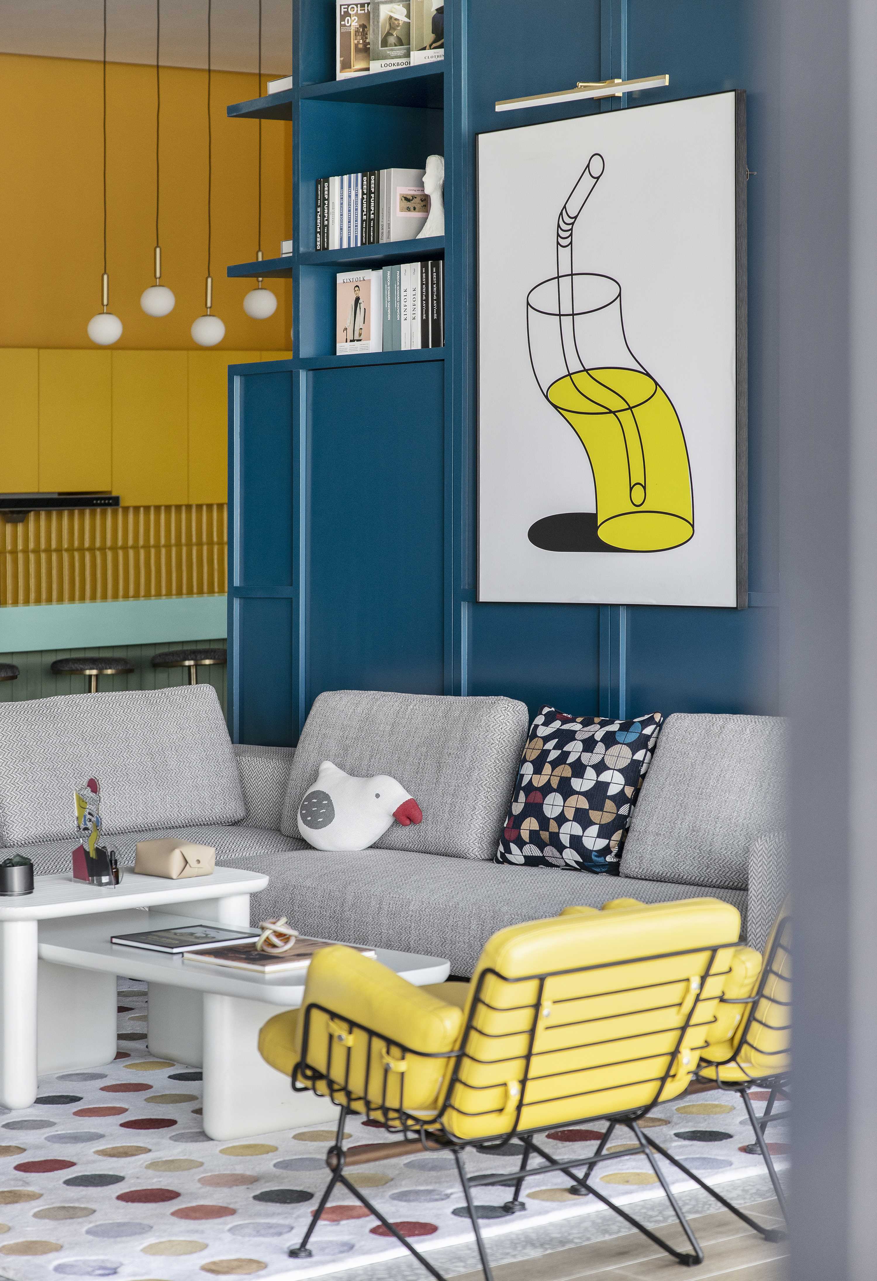 Space connects people, and people socialize in space. The lobby is no longer just a place for your daily visits and short stays. Its functions are diversified and refined. It is the third space opened up between home and company. With multiple formats, multiple functions, and multiple gameplays, people stay here to experience, talk, and socialize. In this space, we hope to establish a sense of belonging for the residents and realize multiple life scenarios.The shared lobby is like a community living room in the city, which can provide humanized functional settings, and is a complex space without boundaries, freedom and enjoyment. Use bright colors to create a young, vibrant, stylish and bold space atmosphere. Let those who come here can enjoy the fun of "shared" life. The blue high bookcase divides the space, and the partition of the shelves maximizes the relationship between the spaces.In the era of big data interaction, it seems that in addition to passive social scenes, it seems that young people can hardly find the fun of face-to-face social entertainment, and they are more likely to gather together based on passive relationships. At this moment, we need to rescue people from self-entertainment, participate more in groups, and integrate into conversation and entertainment. Put down your phone and go out to meet more friends. In leisure time, you can also invite three or five friends to watch a favorite movie and play a cheerful game. Here, different functions deduce different scenarios.