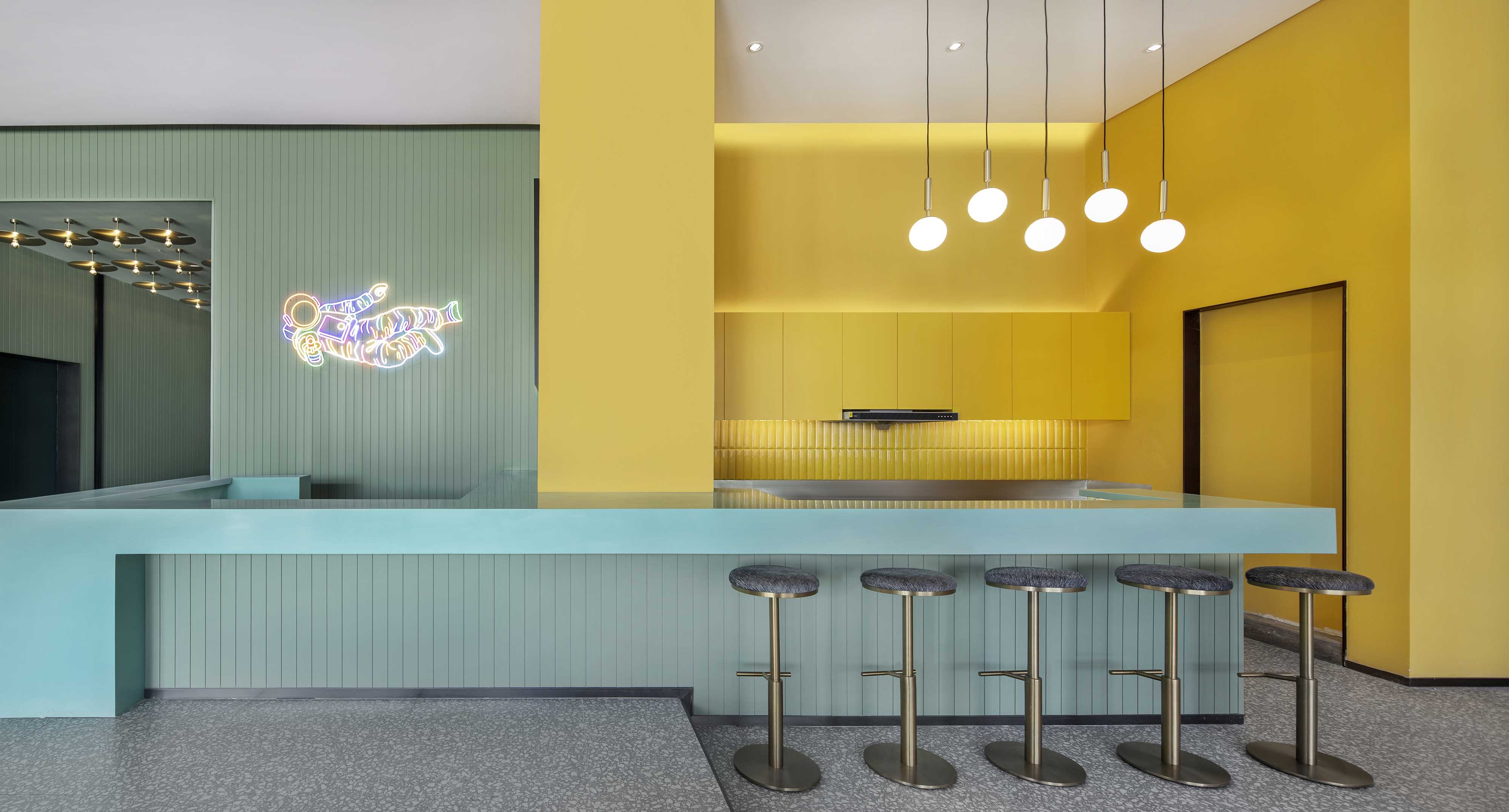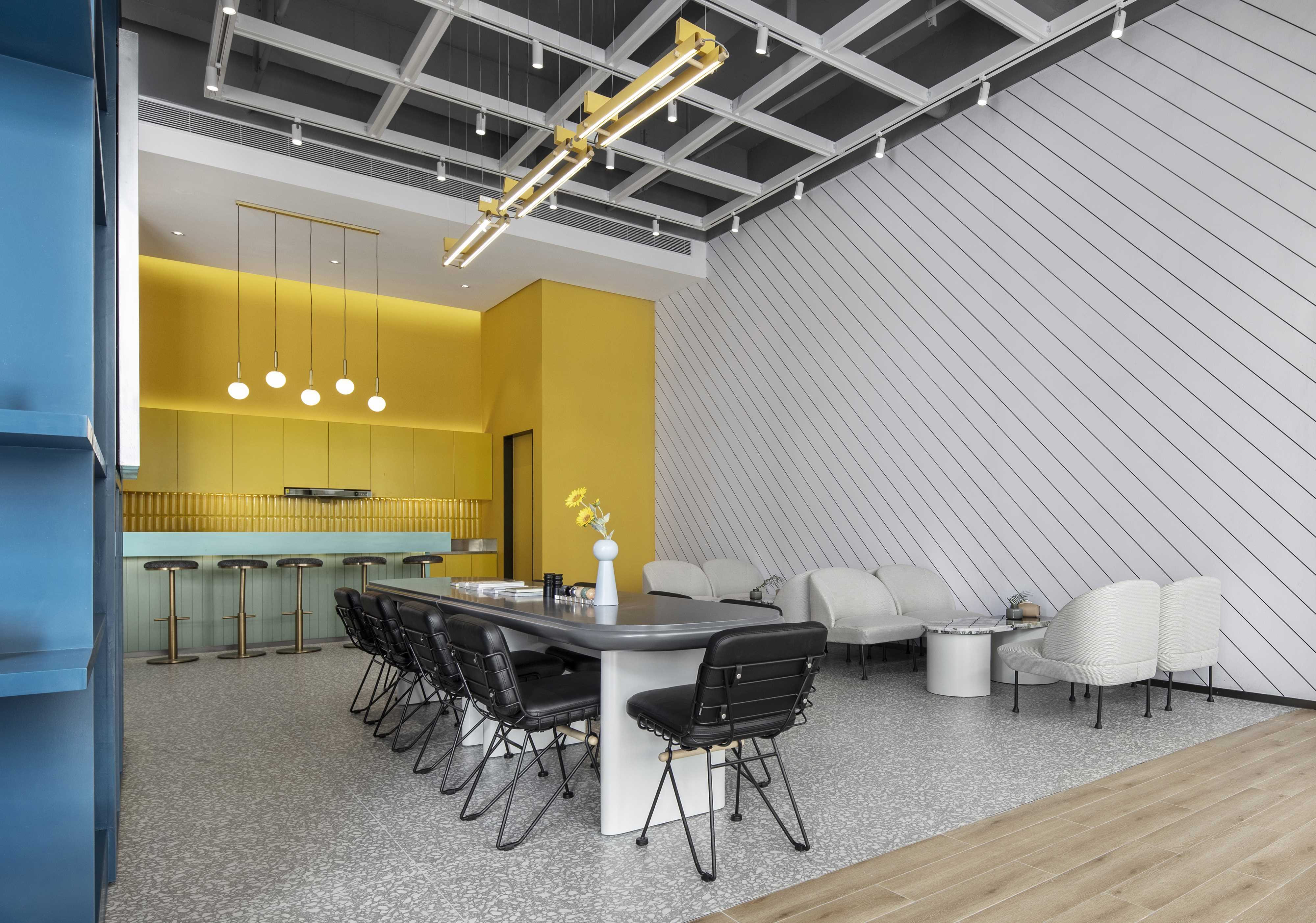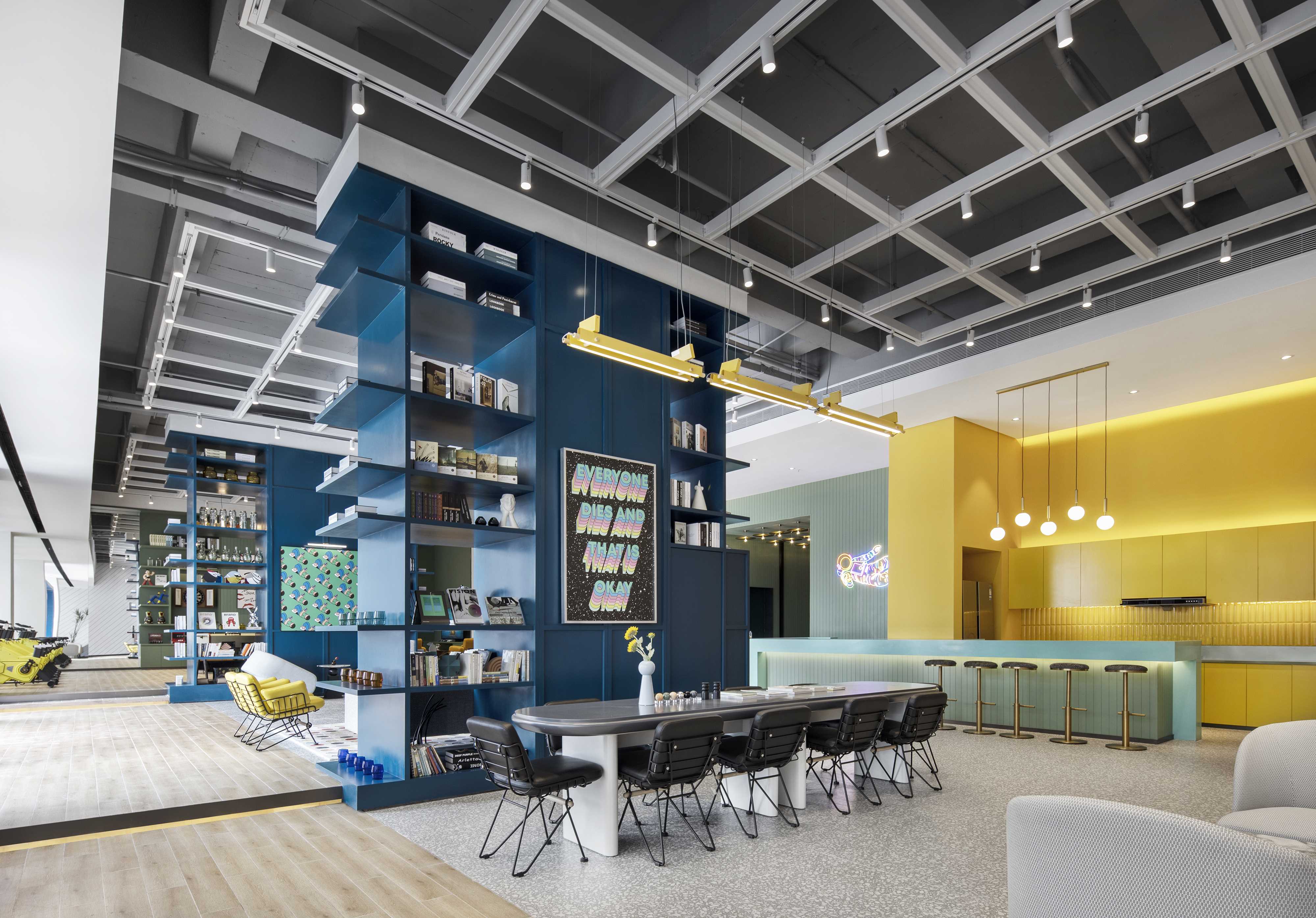 The entertainment area is equipped with switches, video and audio projections, darts, table football, and VR spinning bikes. The dynamic entertainment facilities provide young people with more interactive opportunities. It is also a display area for trendy products. A dazzling array of trendy toys are carefully placed on the shelf. Astro Boy, Fighting Duck, and arcade game consoles add a touch of fun to the space. The spinning bikes placed next to the window allow people to enjoy the beautiful scenery outside the window while exercising, with plenty of light, allowing you to get rid of lazy cancer and zero distance with a healthy life under the invigorating exercise.The reception desk and the shared kitchen bar are integrated and independent of each other. In the fast-paced urban life, they go out early and return late every day and work hard; here is a place for urban youth to cook. On weekends, you can meet a group of friends to cook and experience a tip-topping experience. Delicious food. Promote emotional exchanges between each other. The bright yellow hue gives people a vigorous spirit and can convey happiness to people. Not only can sharing and exchange meetings be held from time to time, but also a place for reading can be provided here, which not only provides material satisfaction, but also enriches the spiritual world. We are going to tell more young people "This is how life should be! "