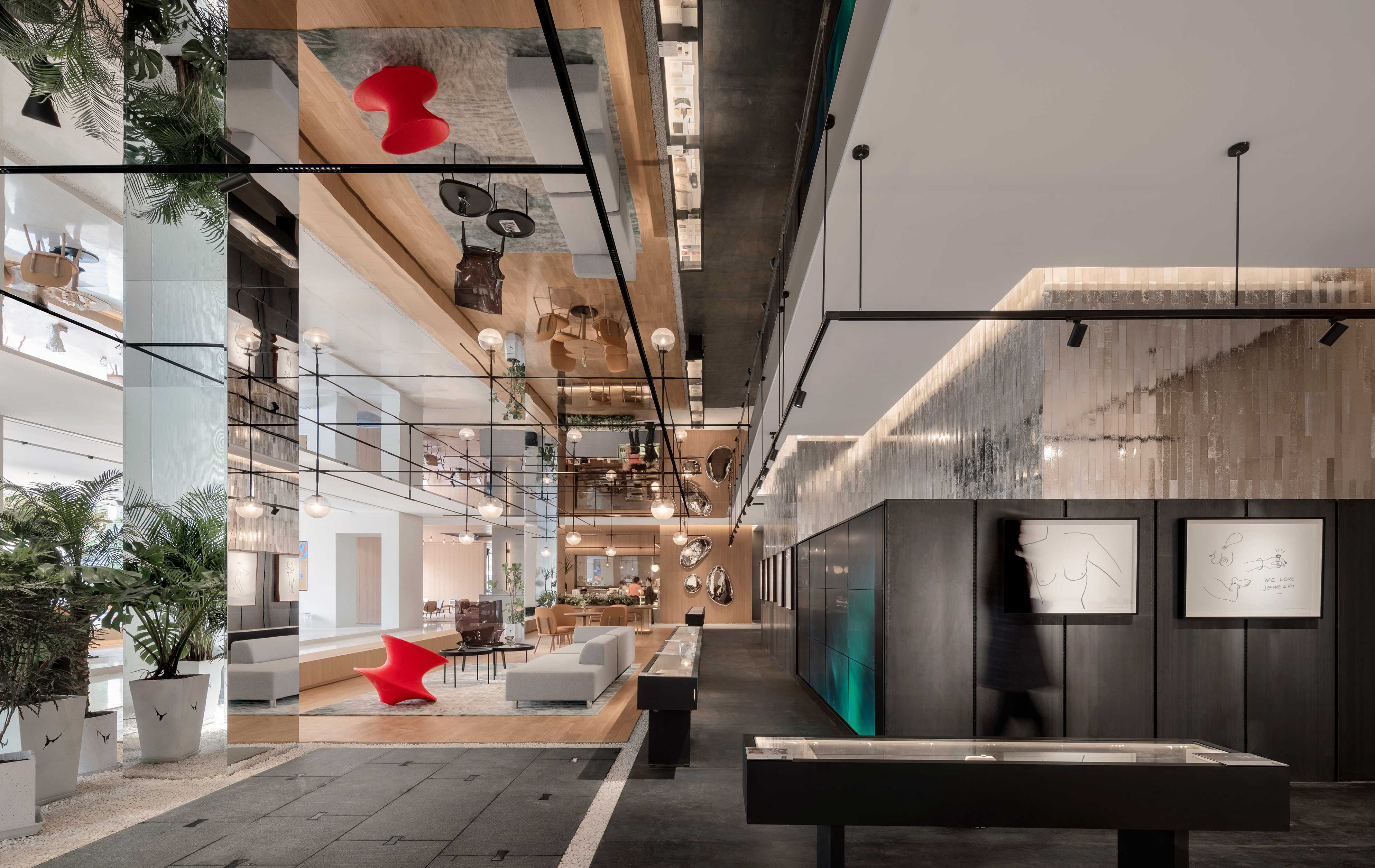 For Hangzhou Canal Impression’s INLAB, the Super Normal team divided the space into distinct zones, including a pop-up shop, a sunlit conservatory, a gallery walkway, a bar, storage areas, indoor and outdoor lounges, and even spaces for art exhibitions. Sales functions are seamlessly integrated into these zones, each designed to evoke relaxed daily experiences. By breaking the sequential flow of traditional spaces, this free-form layout emphasizes a truly human-centric experiential journey.